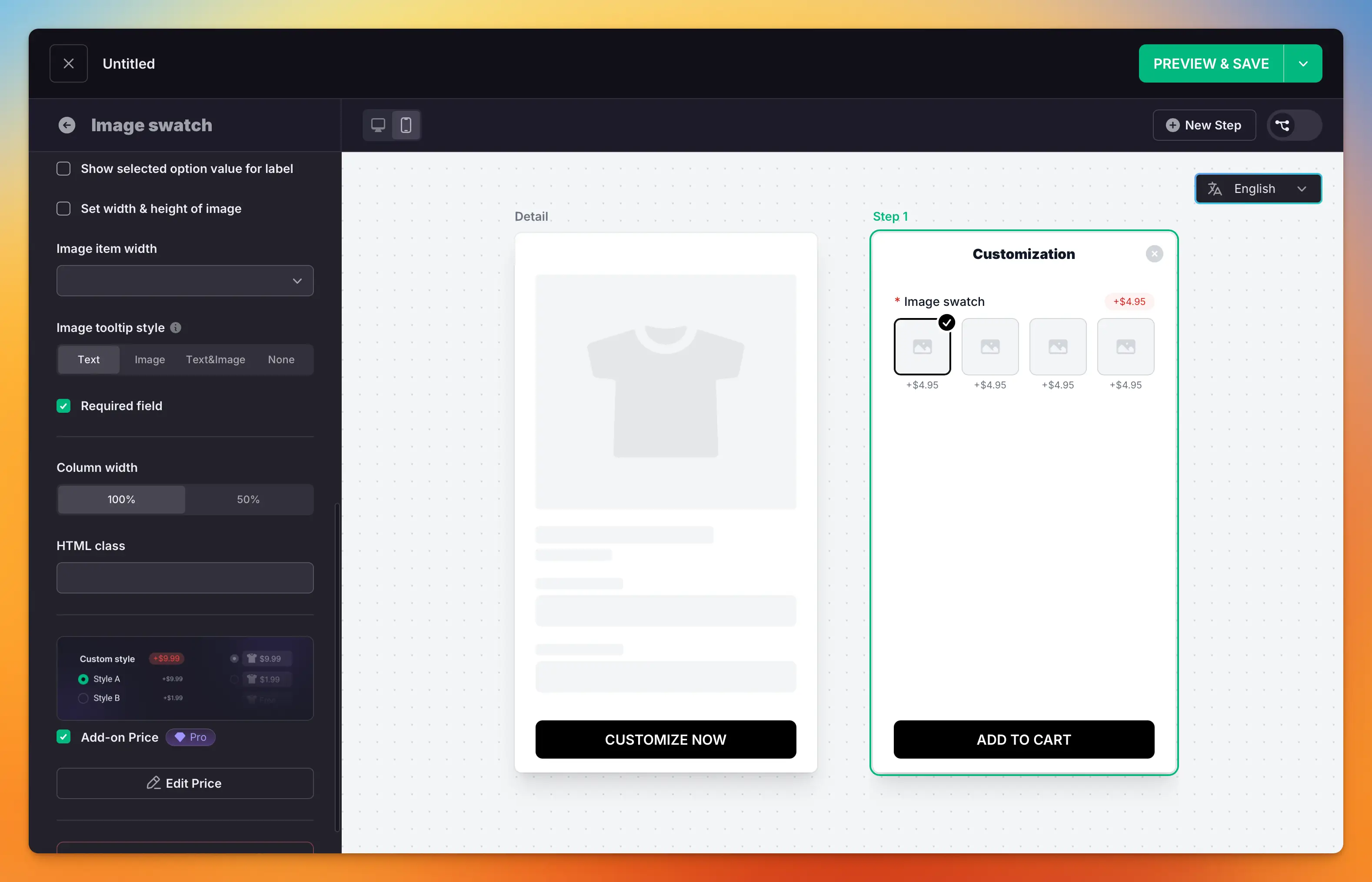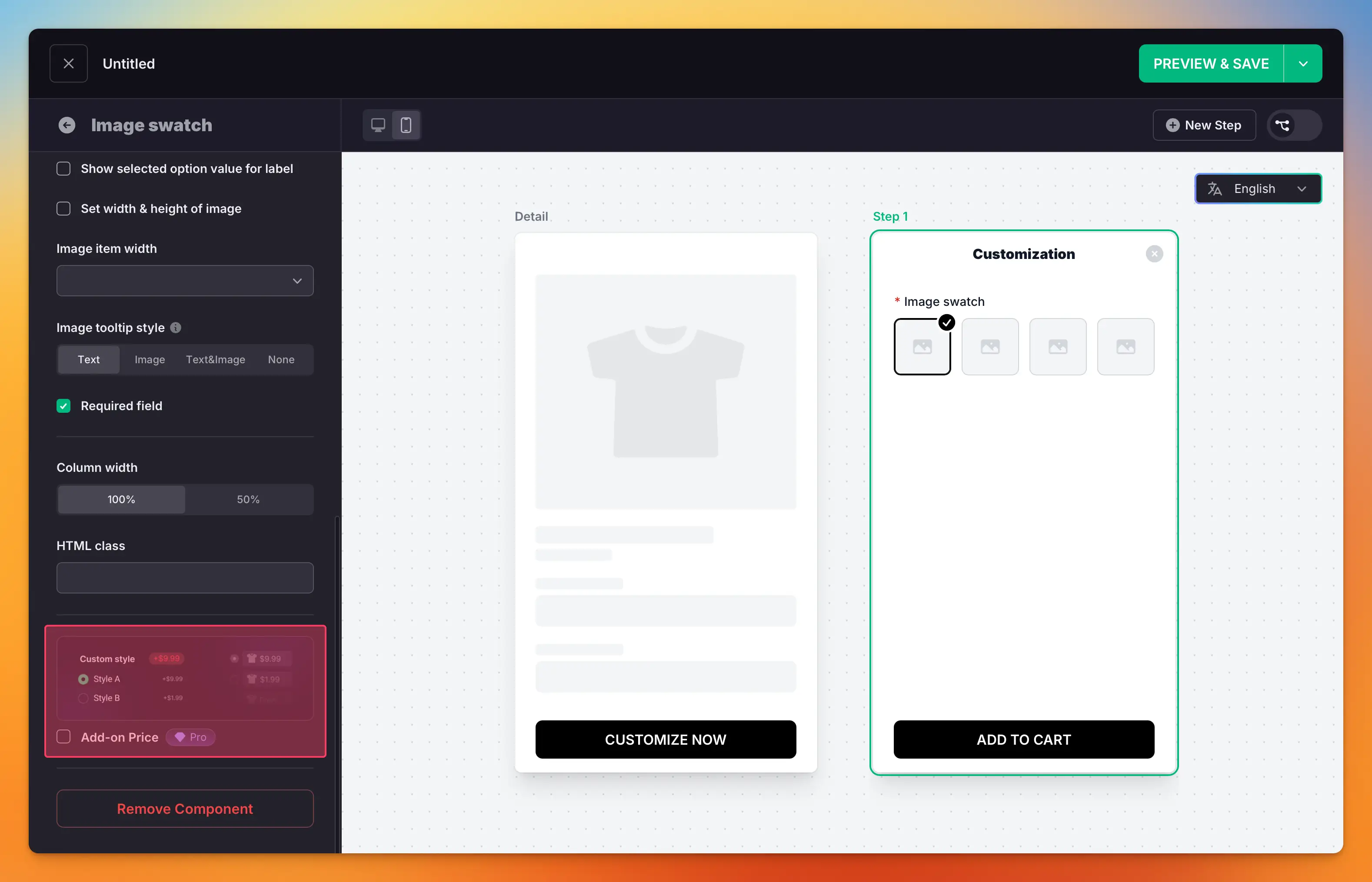 - Radio, Checkbox, Image swatch, Select Font, Select Menu, Color Swatch, Multi Level Image Swatch and Dynamic Select.